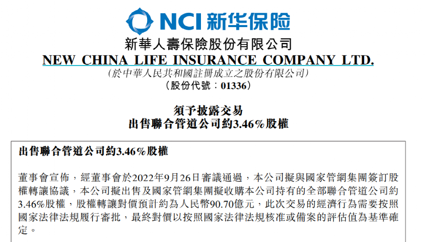 另外,新华保险在9月26日当晚还公布了一则利好消息:经董事会审议通过,新华保险拟向国家石油天然气管网集团有限公司出售新华保险持有的全部国家管网集团联合管道有限责任公司约3.46%股权,股权转让对价预计约为90.70亿元。