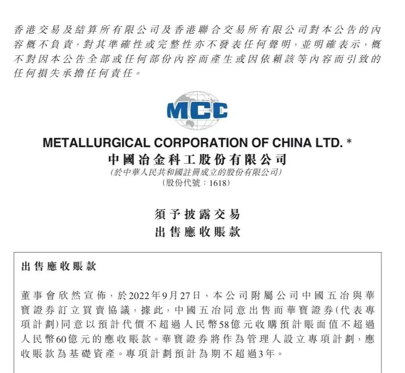 根据该协议,中国五冶同意出售,而华宝证券同意以预计代价不超过57亿元向中国五冶收购预计账面值不超过60亿元的中国五冶应收账款。华宝证券作为管理人设立上述专项计划,以中国五冶应收账款为相关资产。上述专项计划为期不超过3年。