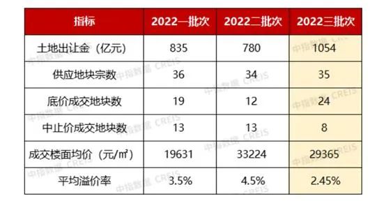 这35宗地总成交金额为1054亿元,是今年收金最多的一轮土拍;平均溢价率2.45%,较第二轮土拍有所降低。